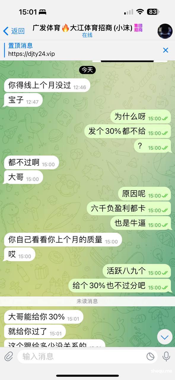 曝光大江体育黑佣金,本人代理号liuxiaomei1做大江体育已经三四个月了,前面每个月负盈利就三四万一般般,八月份因为事情忙没怎么发展负盈利就六千,但是活跃也够了,八个活跃,谁知道招商说佣金审核不通过。 说质量不行,尼玛的眼瞎吧傻逼招商,玩家有输有赢的复存次数,流水也可以,就是诚心卡我是吧,截图会员质量你看,不说55%了给个30%都说得过去,直接一句风控不过,欧洲杯后杀猪看来是真的,难怪你们公司被曝光这么多次,就是钻石十五楼之前叫aoa,现在叫广发/大江两个盘口,员工曝光,会员曝光,代理也曝光,奉劝大家还干这个公司的赶紧跑吧,不然下一个杀猪的就是你?
