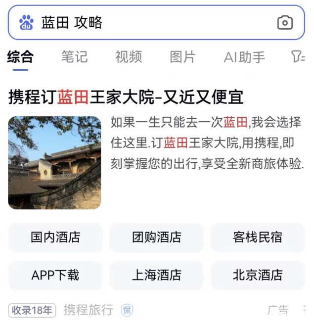 输入【蓝田 攻略】关键词,在百度app中第一屏只能展示2条信息,还都是广告。